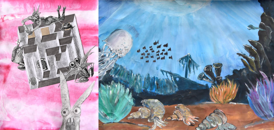 „Mein verzaubertes Labyrinth“ – eine souveräne Zeichnung mit Collage- und Frottagetechniken auf farbigem Grund. Exakt konstruierte Perspektiven verbinden sich mit fantasievollen Wesen voller Witz, Leichtigkeit und Ideenreichtum.