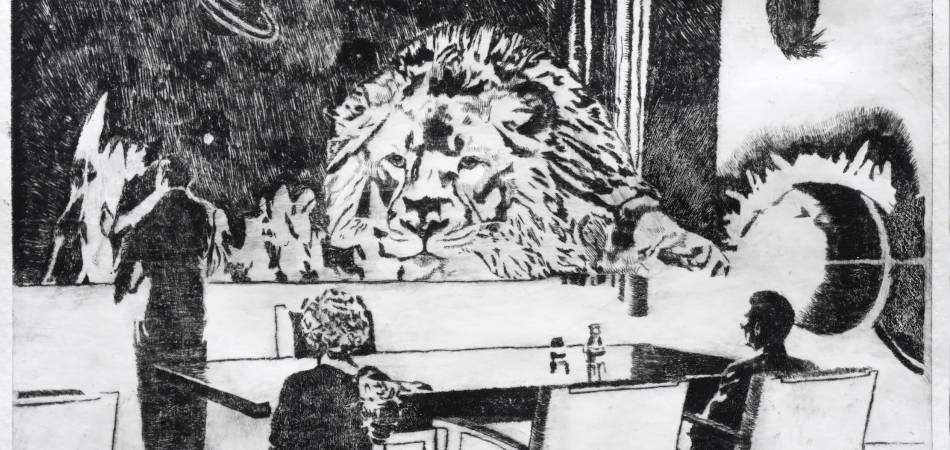 Seine Radierung überzeugt durch den feinen Umgang mit grafischen Mitteln: Schraffuren, Kreuzschraffuren und Linien erzeugen Hell-Dunkel-Kontraste, die eine geheimnisvolle Spannung aufbauen und die traumhafte, rätselhafte Bildwelt verstärken.