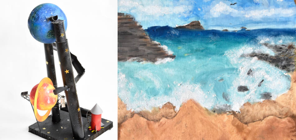 Mit seiner selbstgebauten *Murmelbahn im Weltraum-Stil* überzeugt Matthis auf technischer wie kreativer Ebene. Die Raketenbahn führt vorbei an Planeten, durch Tunnel, über Höhenunterschiede und löst am Ende sogar ein hängendes Element aus – eine originelle und detailreiche Arbeit.