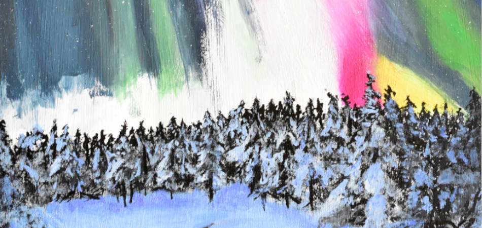 Mit ihrer Schneelandschaft mit abstrahierten Nordlichtern verbindet Maria digitale Farbverzerrungen mit realistischen Naturelementen. Die Gegenüberstellung von technoider Farbwelt und sinnlicher Naturdarstellung eröffnet eine spannende Reflexion zwischen digitalem Zeitalter und Naturerfahrung.